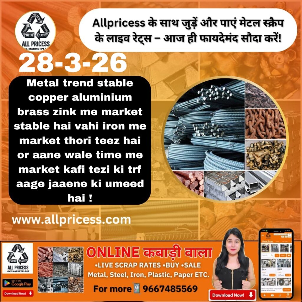 आज के मेटल मार्केट प्रेडिक्शन में हम आपको बता रहे हैं कि लोहे, कॉपर, एल्युमिनियम और अन्य स्क्रैप मटेरियल के रेट में क्या बदलाव हो सकता है। अगर आप स्क्रैप बिजनेस या मेटल ट्रेडिंग से जुड़े हैं, तो यह जानकारी आपके लिए बहुत जरूरी है। सही समय पर खरीद और बिक्री करके आप अच्छा मुनाफा कमा सकते हैं। हमारे इस विश्लेषण में मार्केट ट्रेंड, डिमांड और सप्लाई के आधार पर प्रेडिक्शन दिया गया है।