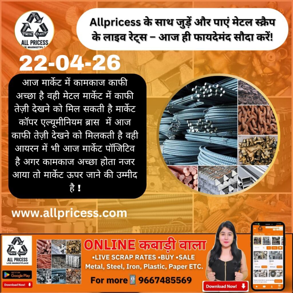 Aaj ka metal scrap market mixed trend dikha raha hai jahan copper scrap me halka upward movement aur aluminium scrap me stable demand bani hui hai. Iron scrap ke rates me thodi fluctuation ho sakti hai market supply aur demand ke hisaab se. Traders ko aaj cautious trading karni chahiye aur local mandi rates par nazar rakhni chahiye.
